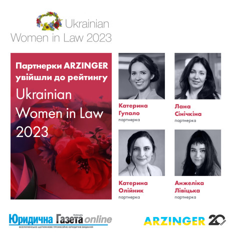 Відразу чотири представниці Arzinger увійшли до рейтингу жінок-лідерок юридичного ринку України Ukrainian Women in Law 2023. Це Катерина Гупало, Лана Сінічкіна, Катерина Олійник та Анжеліка Лівіцька. Дослідження проводила редакція Юридичної Газети. Важливо, що рейтинг має свою історію з 2016 року. Весь цей час експертна команда аналізує зміни, що відбулися, визначає найбільші здобутки, оцінює показники гендерного балансу юридичного ринку.
